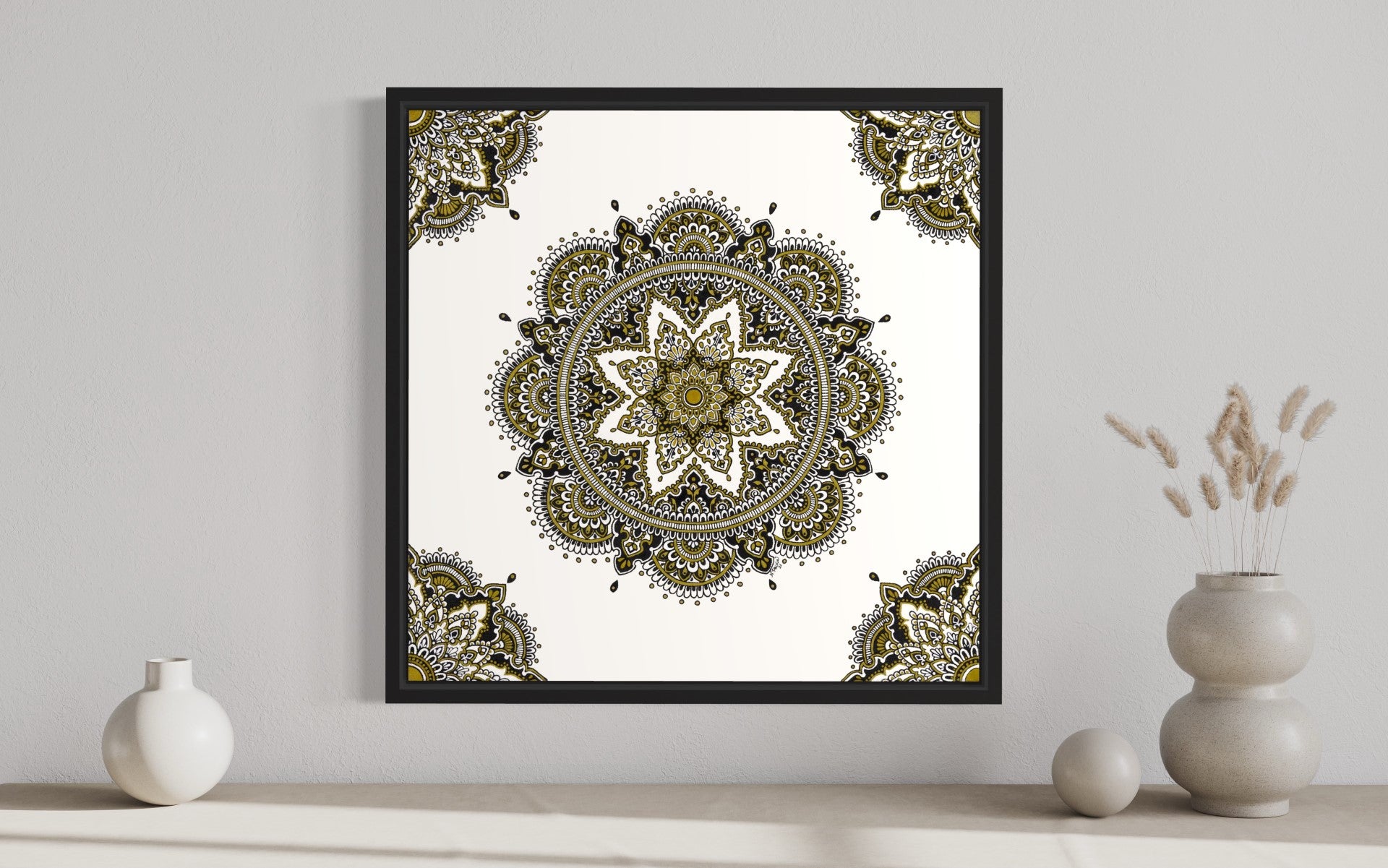 In this Mandala, I love the contrasting edginess of the black with the innocence and purity of the white combined with the uplifting effect of the gold. Since I normally paint with a lot of colors, The use of black, white, and gold in this Mandala painting was challenging to me. I wanted to create a sophisticated pattern, finding harmony in the positive and negative spaces by balancing the purity and light of the white with the darkness and the complete absorption of light coming from the black. I also decided to use the gold to enlighten the intricate pattern and to bring more sophistication to the piece.