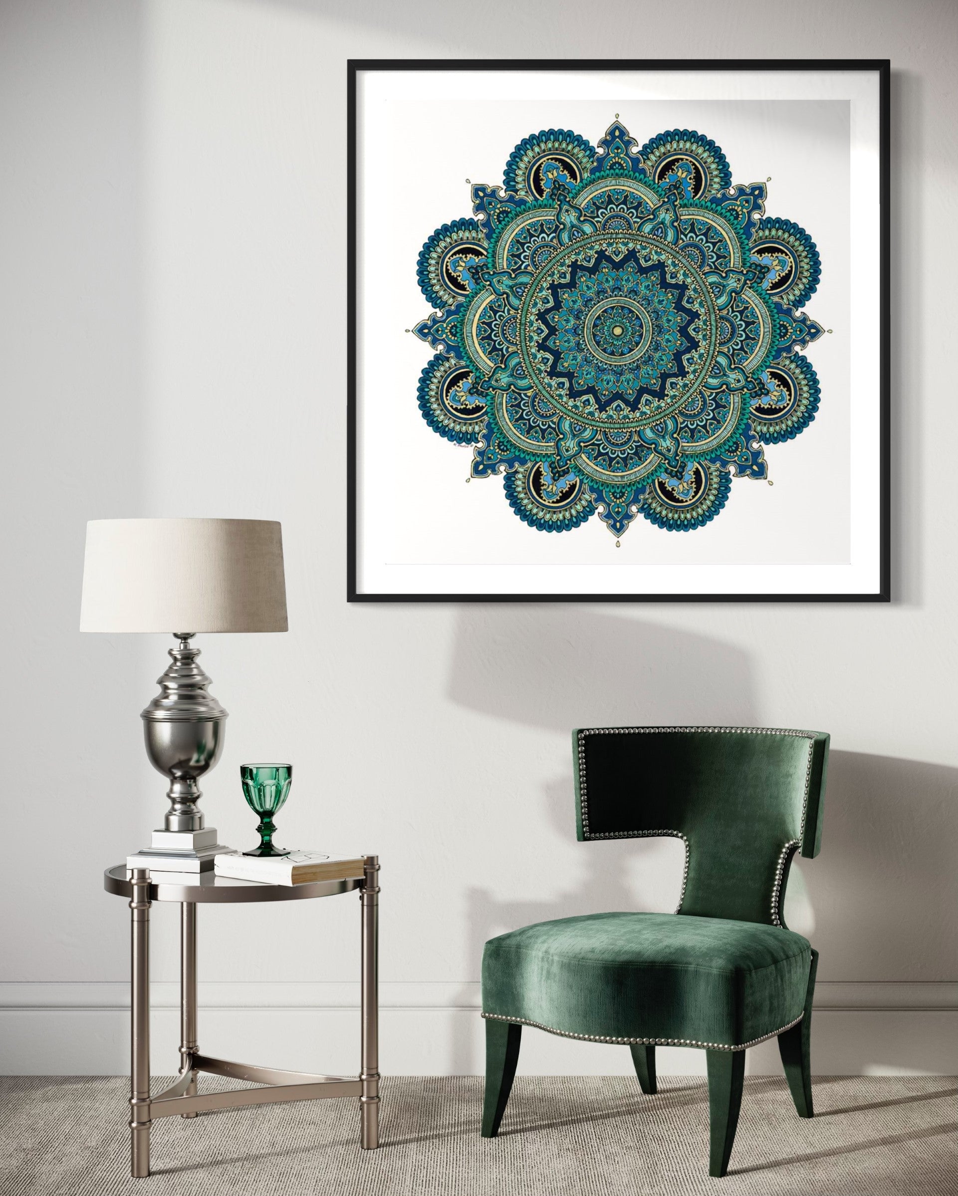 I started this piece while being 5 months pregnant with my son.  I choose green as the main color since this mandala represents hope, new arrival, excitement, anticipation, but also fear of the unknown to me.  Furthermore, it means new beginning, growth and appreciating every moment.