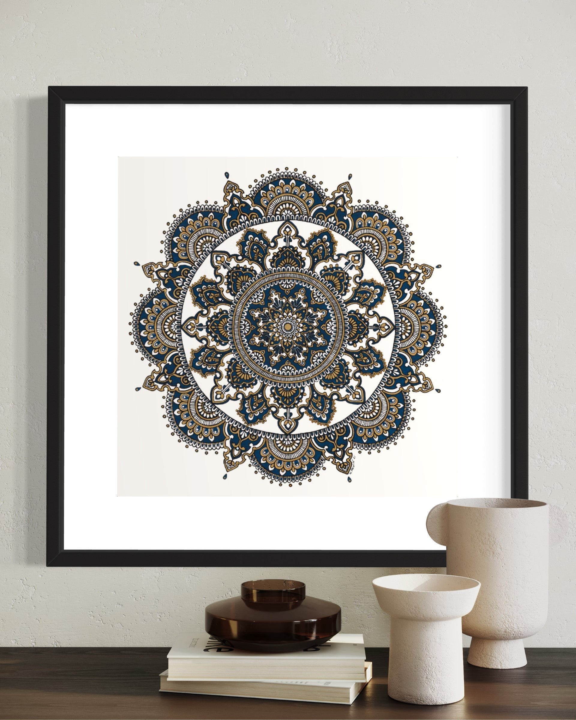 This mandala painting is representing a balance between stability coming from the shade of navy, strength from the bronze and simplicity from the white.